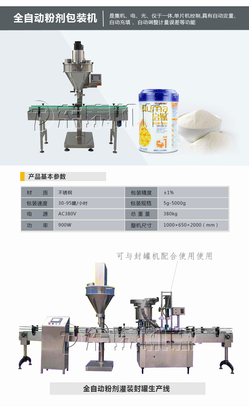 全自動粉劑灌裝機(jī)是一款經(jīng)濟(jì)適用的粉末及小顆粒自動灌裝機(jī),能完成瓶子自動定位,充填及計(jì)量等工作,全自動奶粉灌裝機(jī)由一個充填頭,一臺鏈板輸送帶及一個定位裝置組成,全自動粉劑灌裝機(jī)采用伺服﹙或步進(jìn)﹚馬達(dá),PLC及觸摸屏控制,操作簡便,穩(wěn)定性高?膳c理瓶機(jī)、旋蓋機(jī)、貼標(biāo)機(jī)等組成整套灌裝流水線。