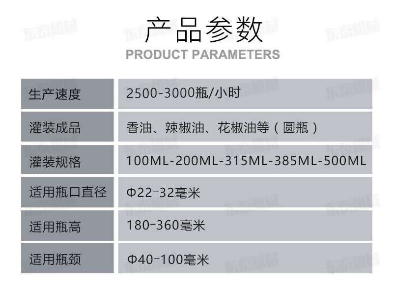 該系列灌裝機(jī)采用容積式計量灌裝原理,適用于各種規(guī)(100ml-1000ml)的南瓜籽油、榛子油、牡丹籽油、芝麻油、核桃油、山茶油、亞麻籽油、棉籽油、橄欖油、大豆油、玉米油、菜籽油等食用油灌裝。設(shè)備采用伺服驅(qū)動活塞計量,保證了 1‰的灌裝精度,在保證灌裝精度的同時,提高了 20%-35%灌裝速度,操作簡單,維護(hù)方便,節(jié)省人工成本,生產(chǎn)效率更高。