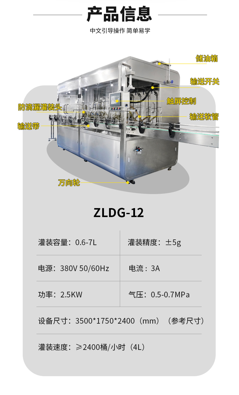工業(yè)油潤(rùn)滑油灌裝機(jī)技術(shù)參數(shù) 灌裝速度:3600瓶/小時(shí)  電源電壓 380V 5.6KW  機(jī)器外形尺寸:長(zhǎng)*寬*高400cm*200cm