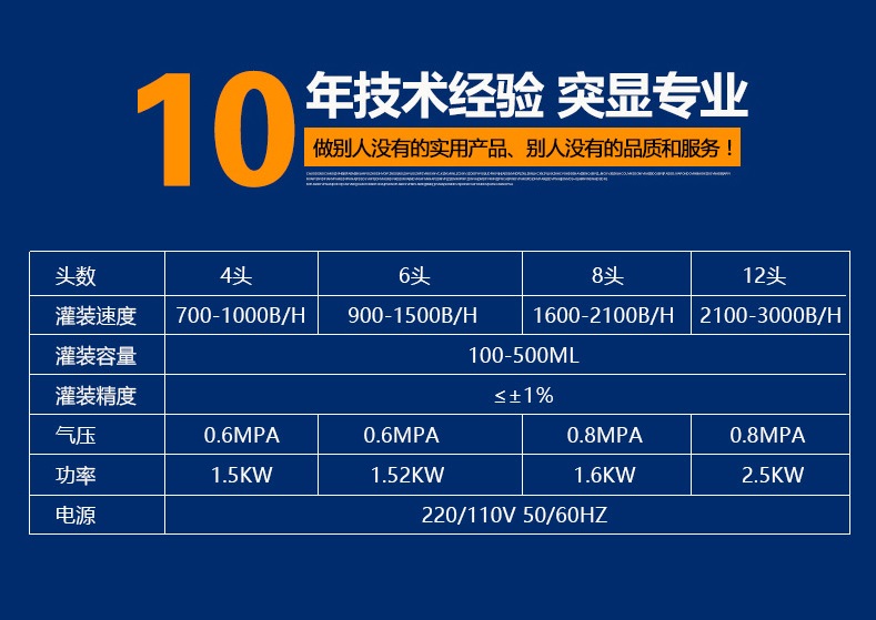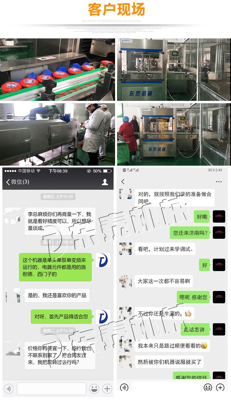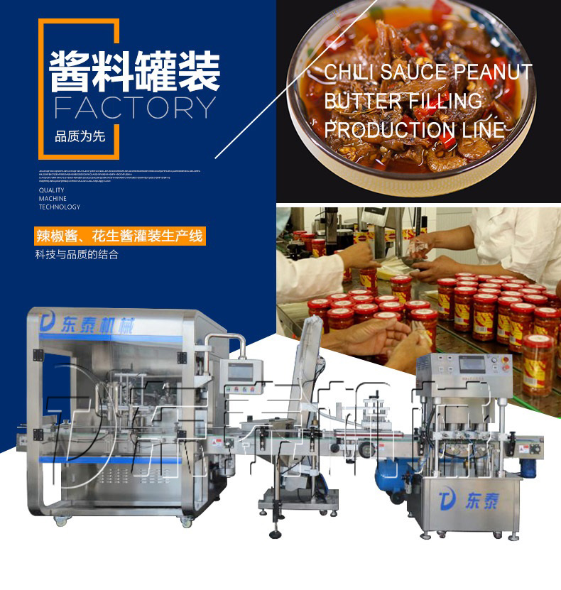 該生產(chǎn)線適合中小口徑三旋、四旋玻璃瓶調(diào)味醬的分裝,適合醬料、含顆粒黏稠物料的灌裝,物料接觸部分均采用316不銹鋼,整機304不銹鋼,符合食品衛(wèi)生標(biāo)準(zhǔn)。該機設(shè)計合理,機型小巧,立式結(jié)構(gòu),節(jié)省場地,操作方便。啟動部分均采用德國FESTO和臺灣AirTack的氣動元件。灌裝閥有氣動閥控制,灌裝精度更高,灌裝量和灌裝速度均可任意調(diào)整,灌裝悶頭采用防拉絲及升降灌裝裝置。
