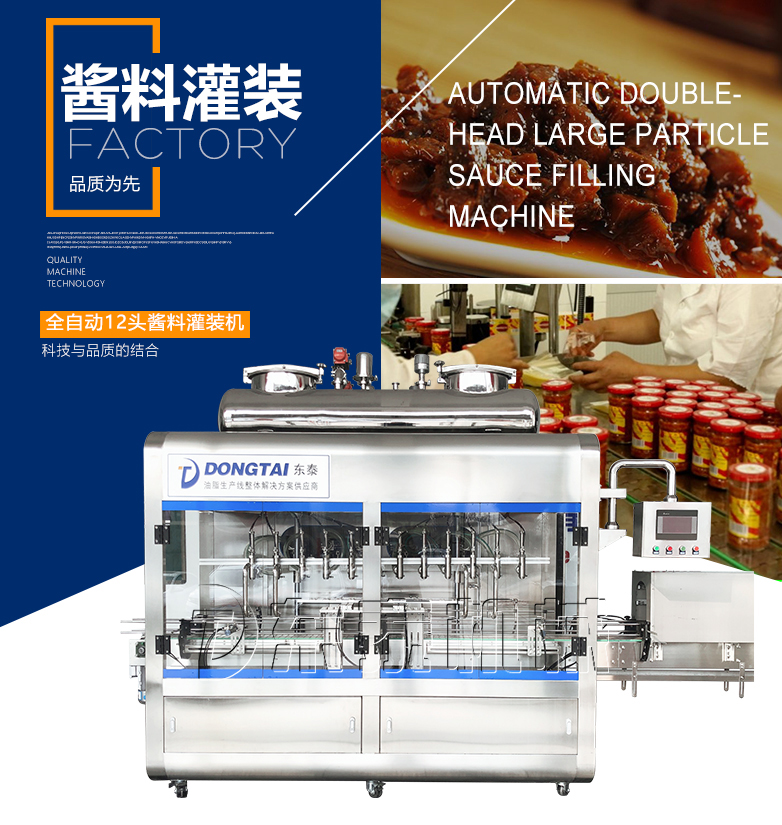 灌裝機采用活塞式灌裝原理,適用于調(diào)味品中帶顆粒并且濃度較大的辣椒醬、豆瓣醬、花生醬、香菇醬、果醬、牛油火鍋底料、紅油火鍋底料、蝦醬等較為粘稠醬類的灌裝。
